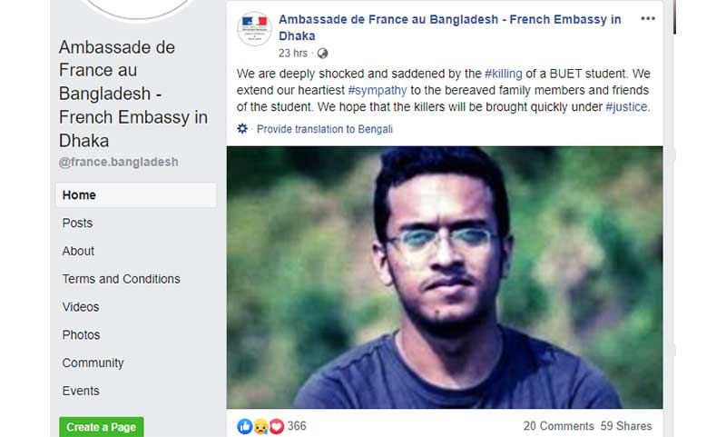 অন্যদিকে ঢাকায় ফ্রান্স দূতাবাসের অফিশিয়াল ফেসবুক পেজে আবরারের ছবিসহ প্রচারিত এক পোস্টে বলা হয়, ‘বুয়েট শিক্ষার্থীর হত্যার ঘটনায় আমরা (ফ্রান্স) অত্যন্ত মর্মাহত এবং বিস্মিত। আমরা ওই শিক্ষার্থীর শোকাহত পরিবার-স্বজন এবং বন্ধুদের প্রতি আন্তরিক সমবেদনা জ্ঞাপন করছি।